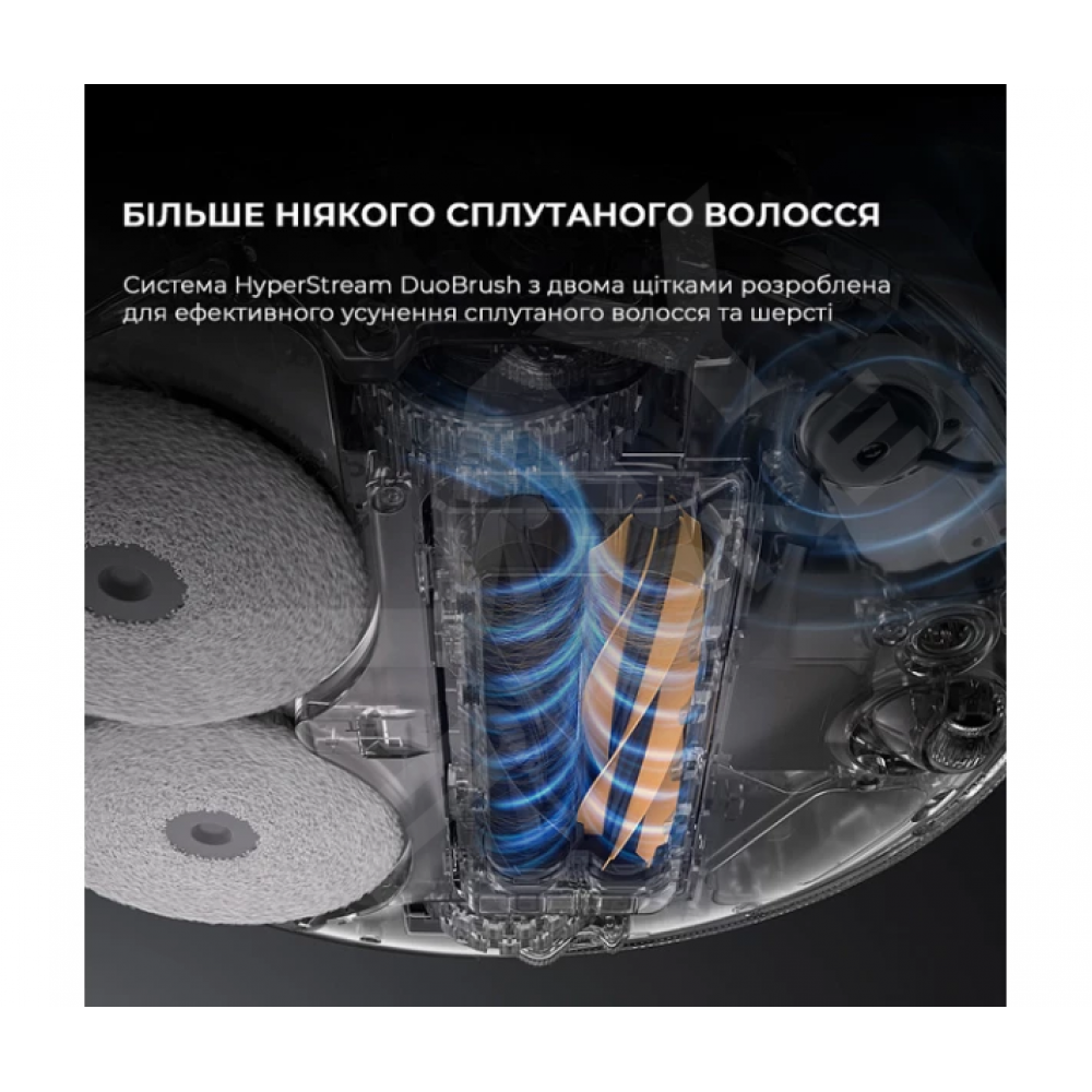 HyperStream DuoBrush з двома щітками розроблена для 100% усунення сплутаного волосся. Вона легко справиться з пасмами довжиною до 30 см. Потужне всмоктування у поєднанні з гумовою щіткою зі щетиною та гумовою щіткою з ТПУ забезпечує ефективне видалення волосся з усіх видів підлог зводячи до мінімуму шум і щоразу забезпечуючи ретельне та тихе прибирання.