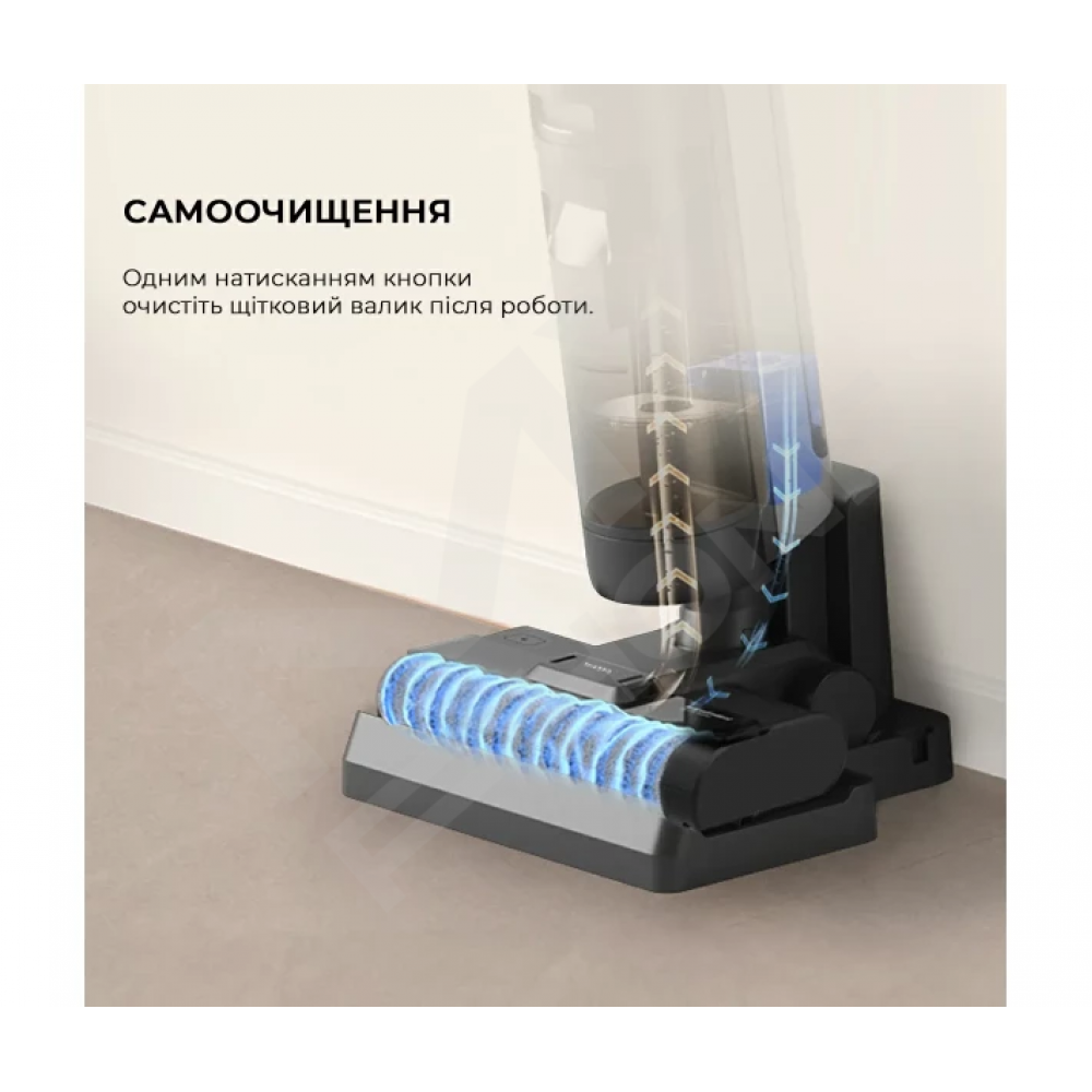 Тепер процес очищення пилососа став максимально гігієнічним і унеможливлює будь-який контакт з алергенами. Достатньо встановити його на док-станцію та активувати функцію самоочищення, і станція автоматично запустить процес подачі чистої води, яка ефективно очистить щітку та всмоктуючий отвір від усіх залишків бруду та сміття. Для забезпечення оптимальної роботи функції самоочищення необхідно, щоб у резервуарі пилососа була чиста вода, а рівень заряду батареї становив щонайменше 20%. Функція автоматичного сушіння насадки гарячим повітрям виключає утворення неприємних запахів та розвиток бактерій.