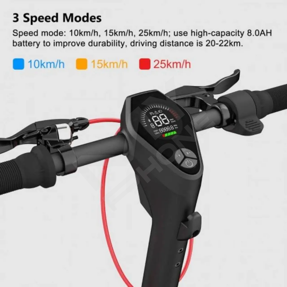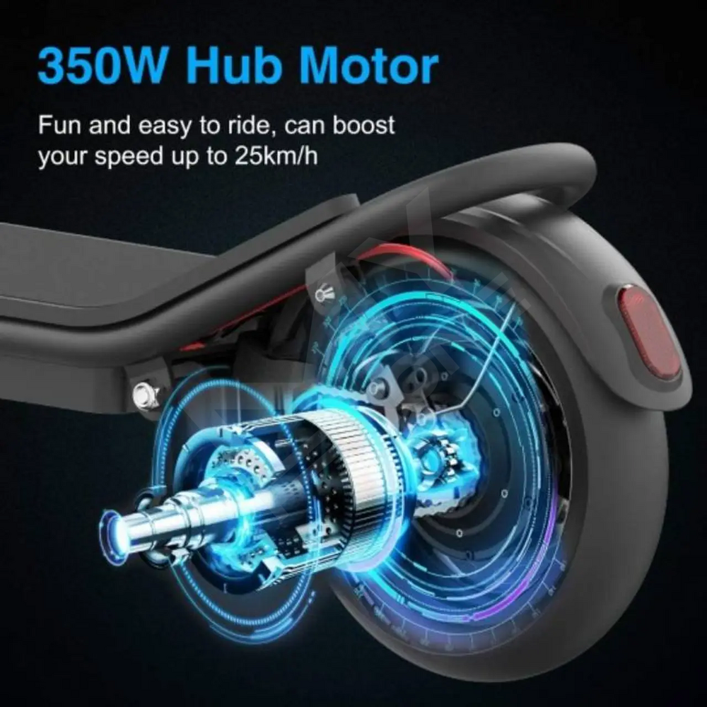 Він обладнаний електричним двигуном потужністю 350 Вт, що забезпечує швидкість до 25 км/год і дальність поїздки до 25 км на одному заряді.