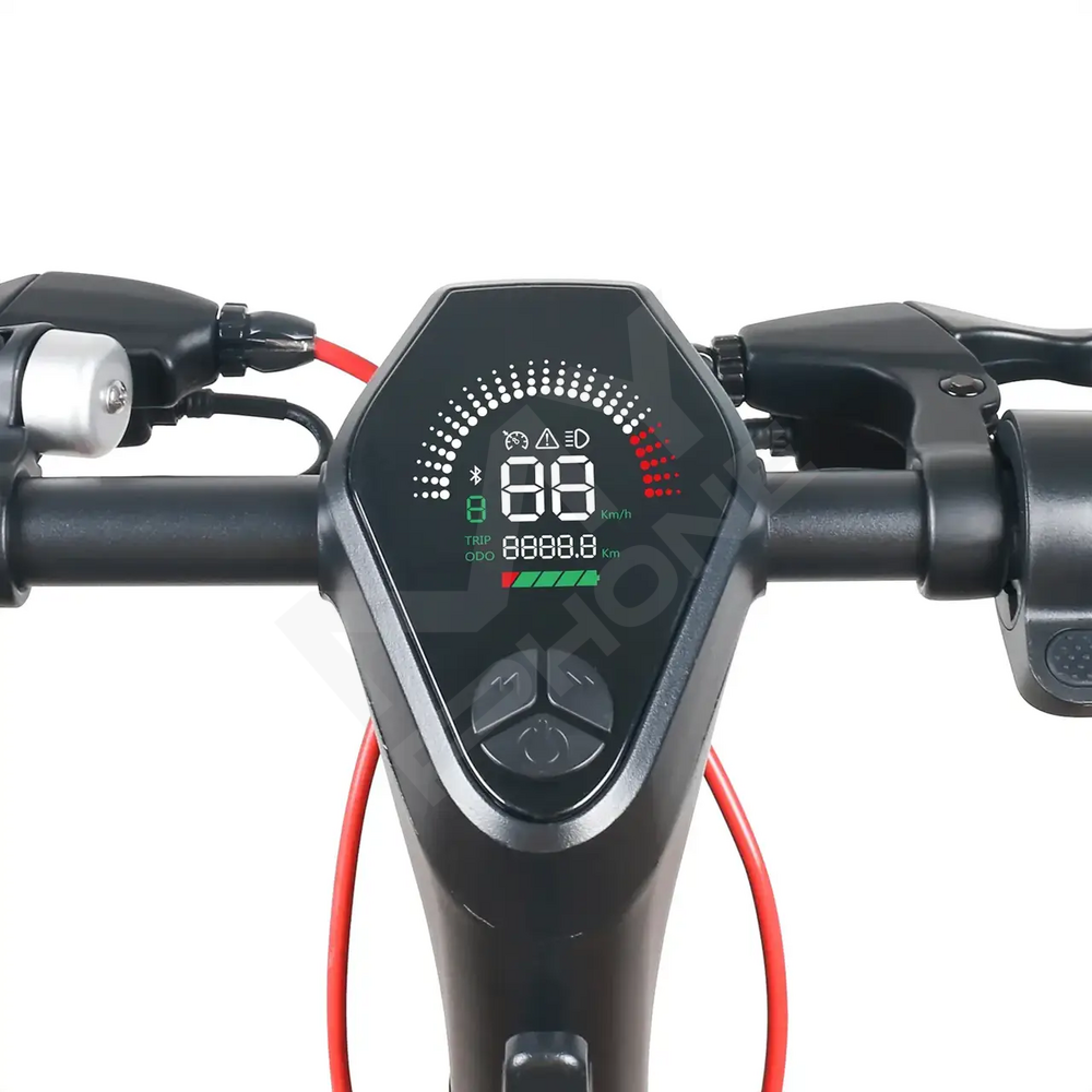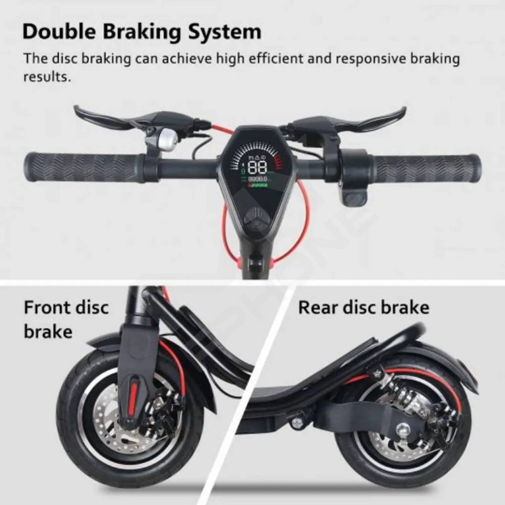 Для безпеки користувача самокат має переднє й заднє світло, а також електронну дискову гальмівну систему, яка забезпечує швидку й безпечну зупинку.