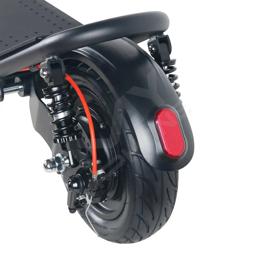 Самокат має розкладну конструкцію, що дає змогу зручно зберігати його в малому просторі. Крім того, він обладнаний амортизаторами на передньому та задньому колесах, що зменшує вплив нерівностей дороги на користувача та робить поїздку комфортнішою.