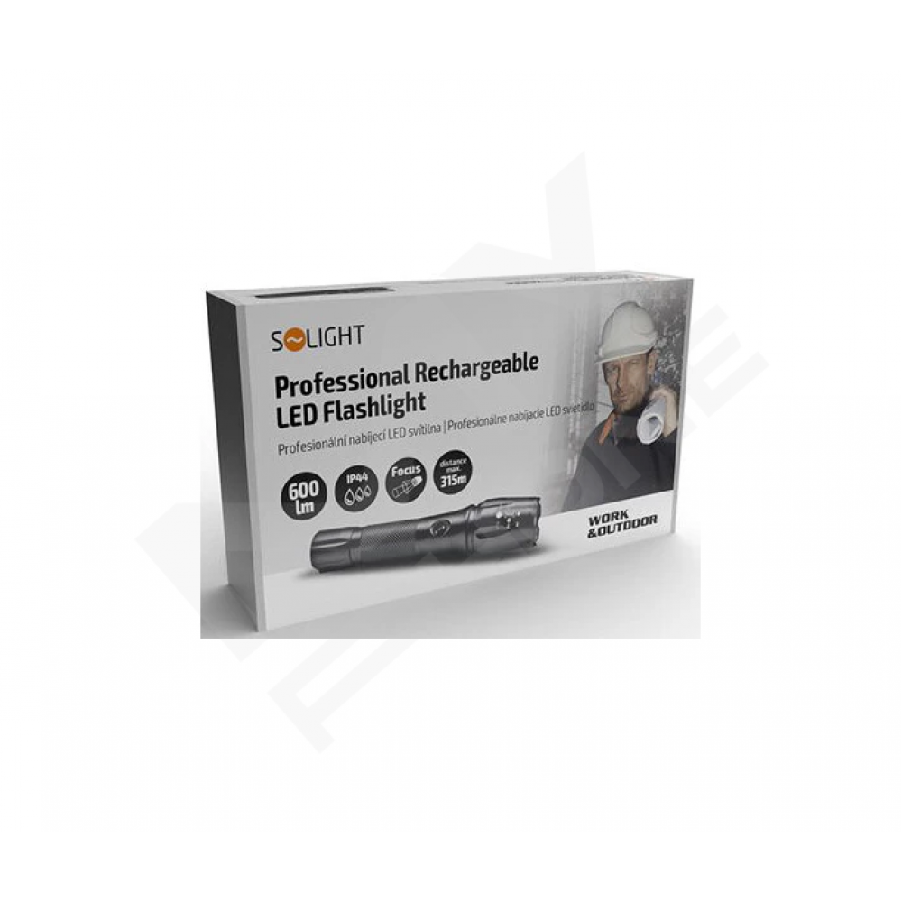Ліхтар Solight WN13 відповідає коефіцієнту IP44. Зовнішня оболонка з алюмінію захищена від впливу вологи та пилу, за рахунок чого застосовувати техніку можна за будь-яких умов. Працює від літій-іонного акумулятора 2200 мАг, який дає 10 годин безперервного світіння. Модель захищена від перезаряду, повний процес енерговідновлення займає 4-5 годин. За бажанням для живлення можна використовувати батареї типу ААА.