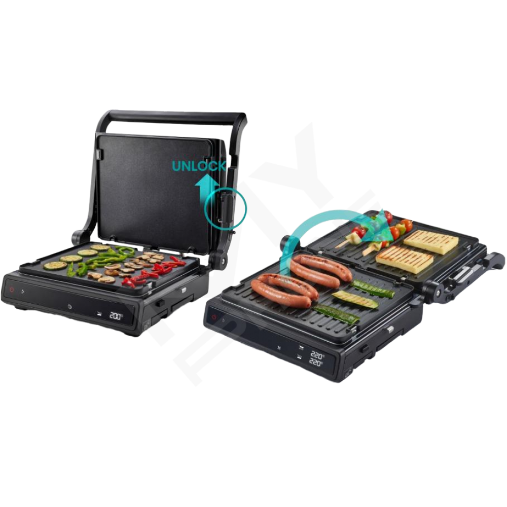 Цей інтелектуальний контактний гриль має функцію обертання на 180 градусів, тому ви можете легко змінювати режим роботи із сендвіч-преса на відкритий гриль. Це зручна й адаптивна функція, яку ви можете використовувати на свій розсуд і яка збільшує площу гриля. Розмір одного гриля становить 28 × 24 см, і ви можете легко подвоїти його. Ви самі вирішуєте, чи швидко приготувати домашнє паніні, чи перевести гриль у режим барбекю для вечірки з друзями. Насолоджуйтеся справжнім відпочинком на свіжому повітрі!