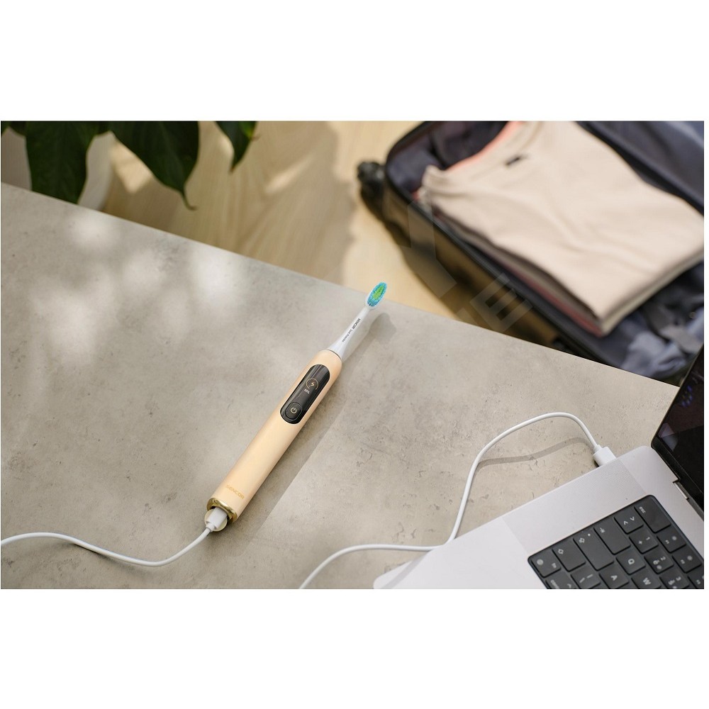 • У комплект входять: 1 корпус зубної щітки, 2 головки, 1 зарядний кабель USB-C