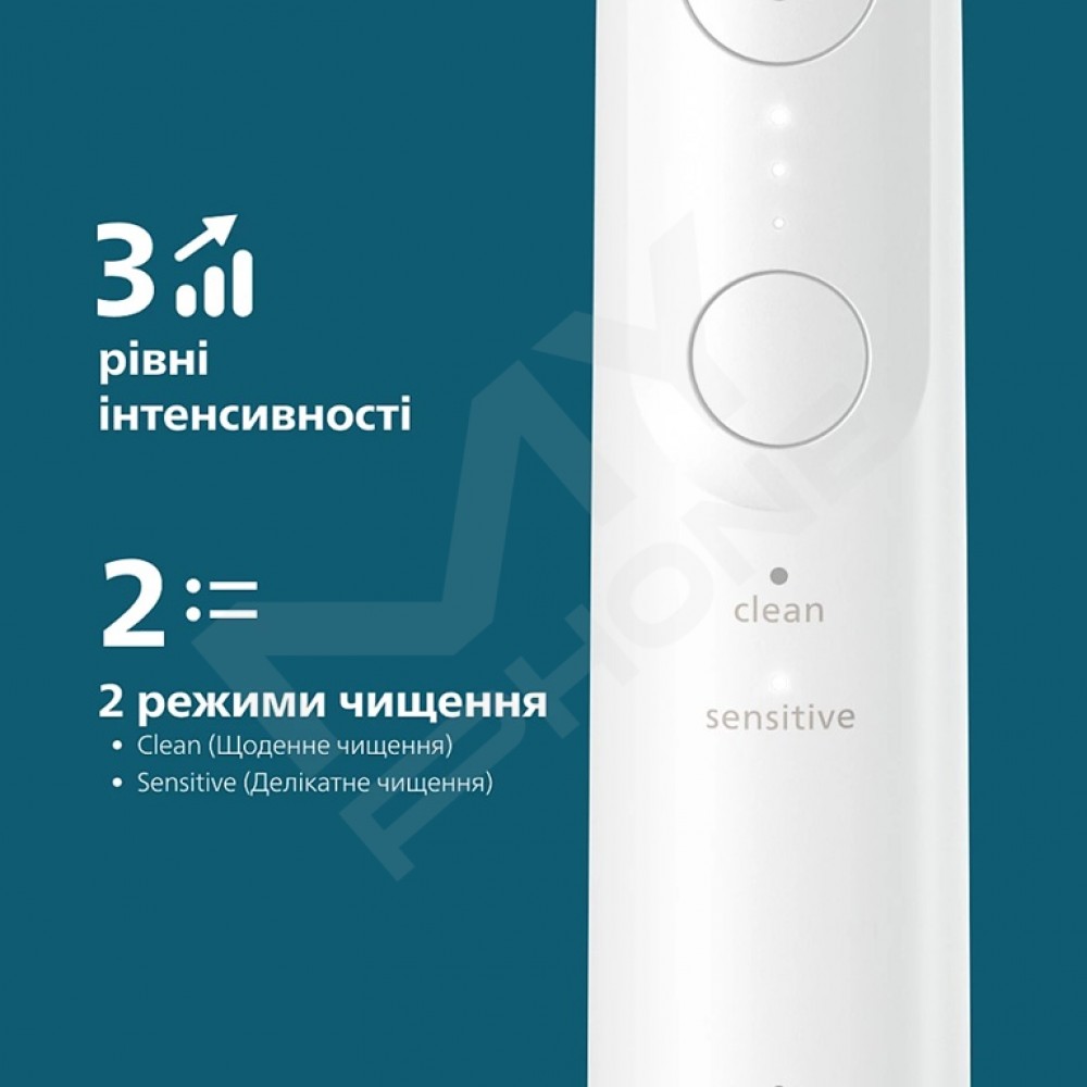 Philips Sonicare 6100 призначена для чищення чутливих ясен і зубів, тому підтримує 2 режими чищення. Режим Sensitive (Делікатне чищення) забезпечує дбайливе чищення, у той час як режим Clean (Чищення) дозволяє видаляти наліт для чудового результату. Ви можете вибрати для будь-якого з цих режимів один з 3 рівнів інтенсивності — від низького до високого — для оптимальних відчуттів під час чищення зубів.