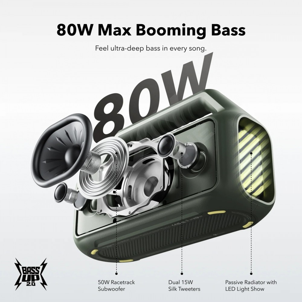 80 Вт максимальної потужності басів: відчуйте силу басів у кожній пісні завдяки сабвуферу Racetrack, який забезпечує додаткову глибину та чіткість звучання. З BassUp™️ 2.0 ви можете налаштувати еквалайзер басів і збільшити потужність з 60 Вт до приголомшливих 80 Вт.