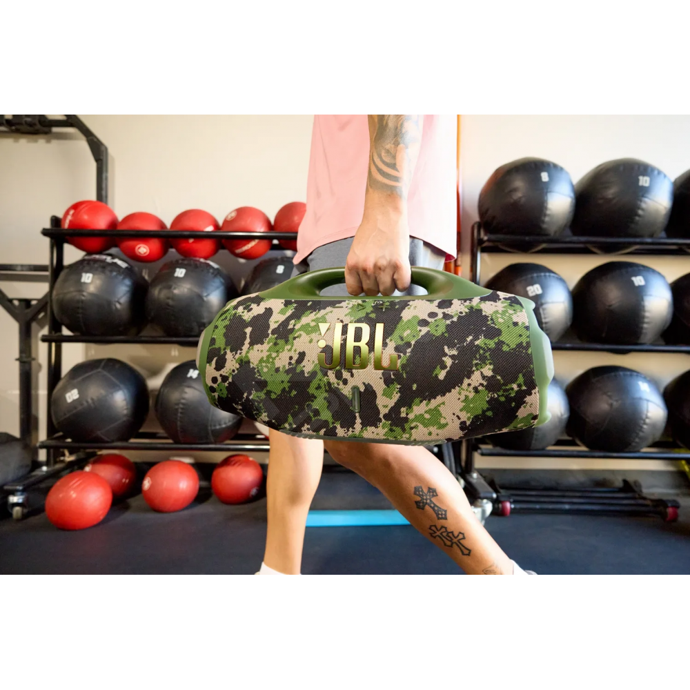 Абсолютно нова колонка JBL Boombox 4 стала більшою, ефектнішою та кращою ніж будь-коли: з потужним JBL Pro Sound, який вирізняється глибиною й виразністю, підкресленою пульсуючим басом. Технологія AI Sound Boost аналізує музику в реальному часі та підсилює звук при мінімальних спотвореннях навіть на максимальній гучності. Модель оснащена двома збільшеними низькочастотними динаміками, двома високочастотними та трьома пасивними радіаторами, завдяки чому кожна композиція звучить ще потужніше й чистіше. Режим Bass Boost дозволяє миттєво зробити звучання ще глибшим і динамічнішим.