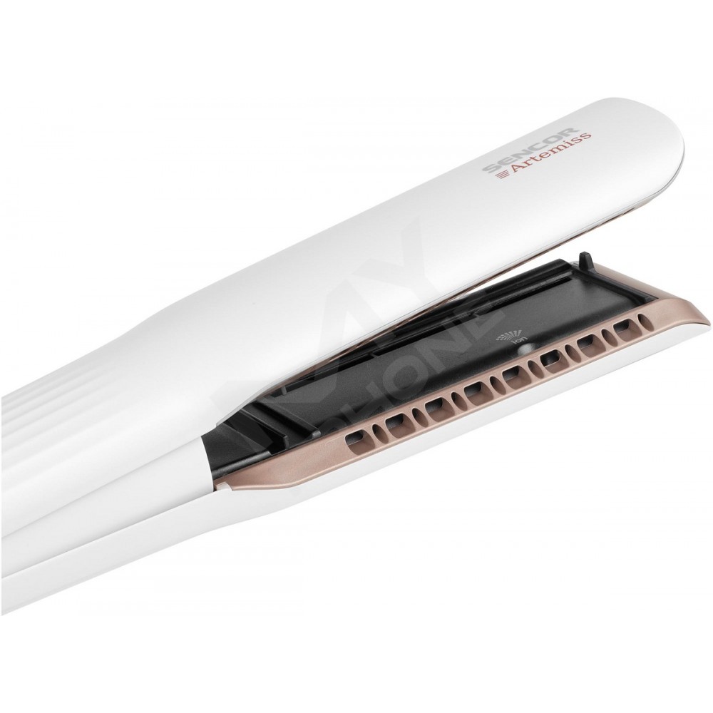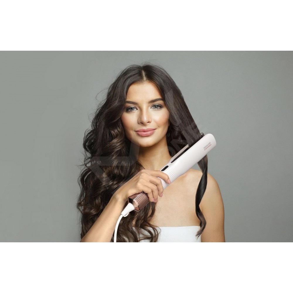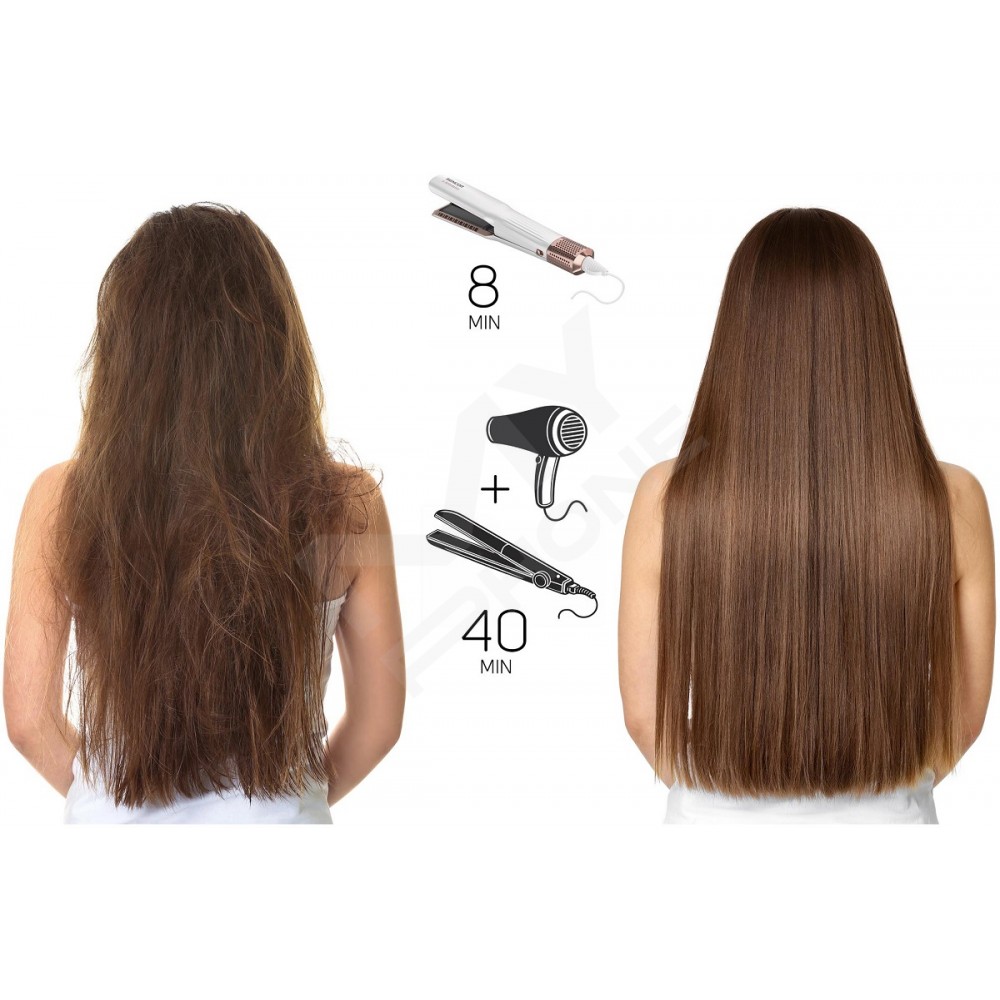 - Без гарячих пластин – потужний повітряний потік одночасно сушить і випрямляє волосся без пошкоджень