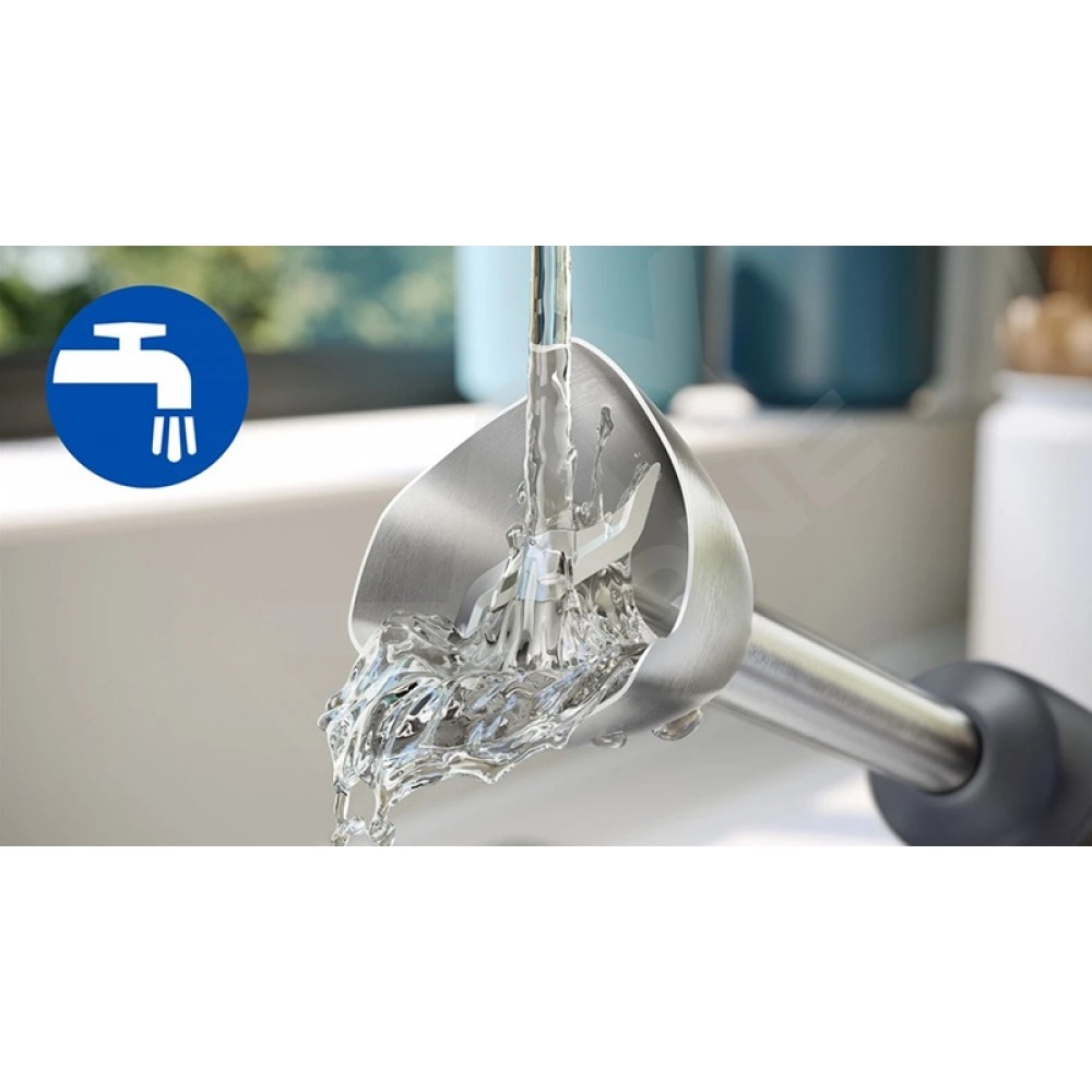 Модель має ергономічний дизайн для комфортного використання. Зручна кнопка дозволяє знімати ніжку блендера однією рукою, що робить процес максимально простим. У комплекті йде мірна склянка об’ємом 0.5 л, виготовлена з матеріалу без BPA, що робить її безпечною для приготування навіть дитячого харчування. Завдяки продуманій конструкції та високій ефективності цей блендер стане практичним вибором для тих, хто цінує швидкість, зручність і якість у приготуванні страв.