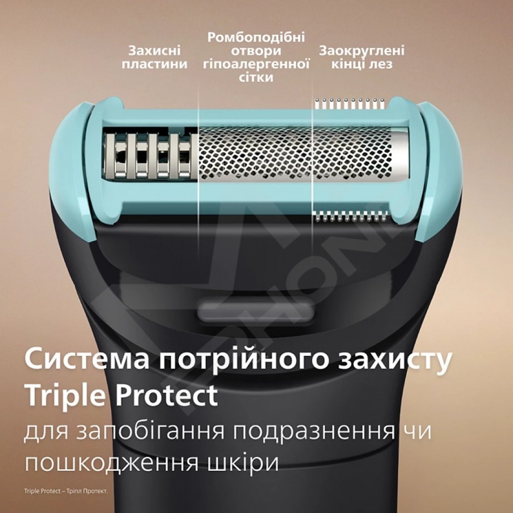 Система гоління Triple Protect має потрійний захист: заокруглені кінці лез для підвищеного комфорту шкіри, гіпоалергенна сітка з ромбоподібними отворами для легкого захоплення великої кількості волосся та захисні пластини на головці для запобігання подразненню чи пошкодженню шкіри.