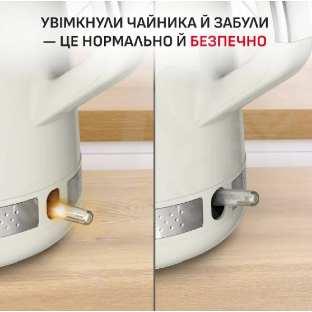 Чайник автоматично вимикається, коли вода закипає або повністю випаровується — для максимальної безпеки та душевного спокою.