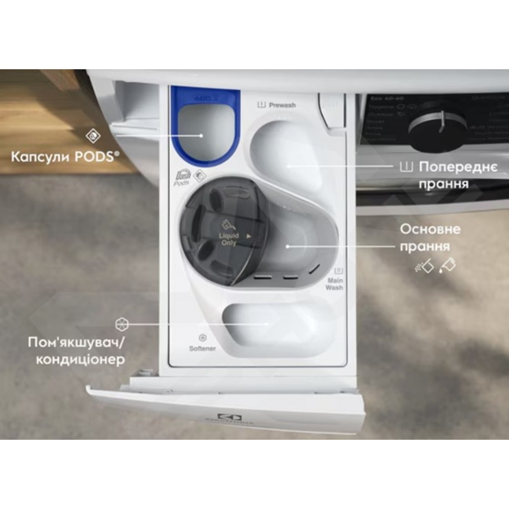 Унікальний висувний контейнер UniversalDose® підходить для всіх пральних засобів, а капсули PODS®* у ньому розчиняються на 60% швидше. Його легко висувати та розбирати, а вихровий рух води підтримує чистоту всередині. Засіб для прання залишається до початку циклу, що зменшує його надмірне використання.