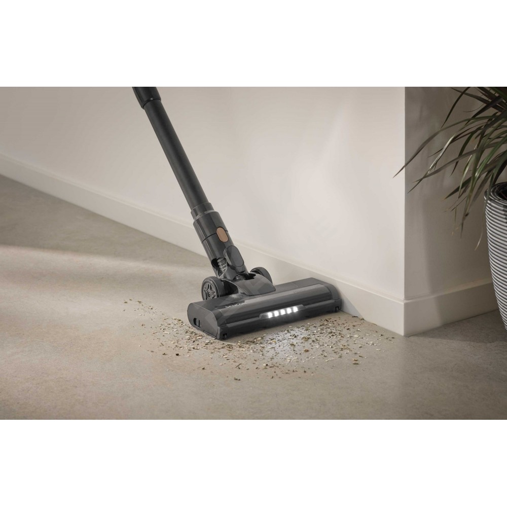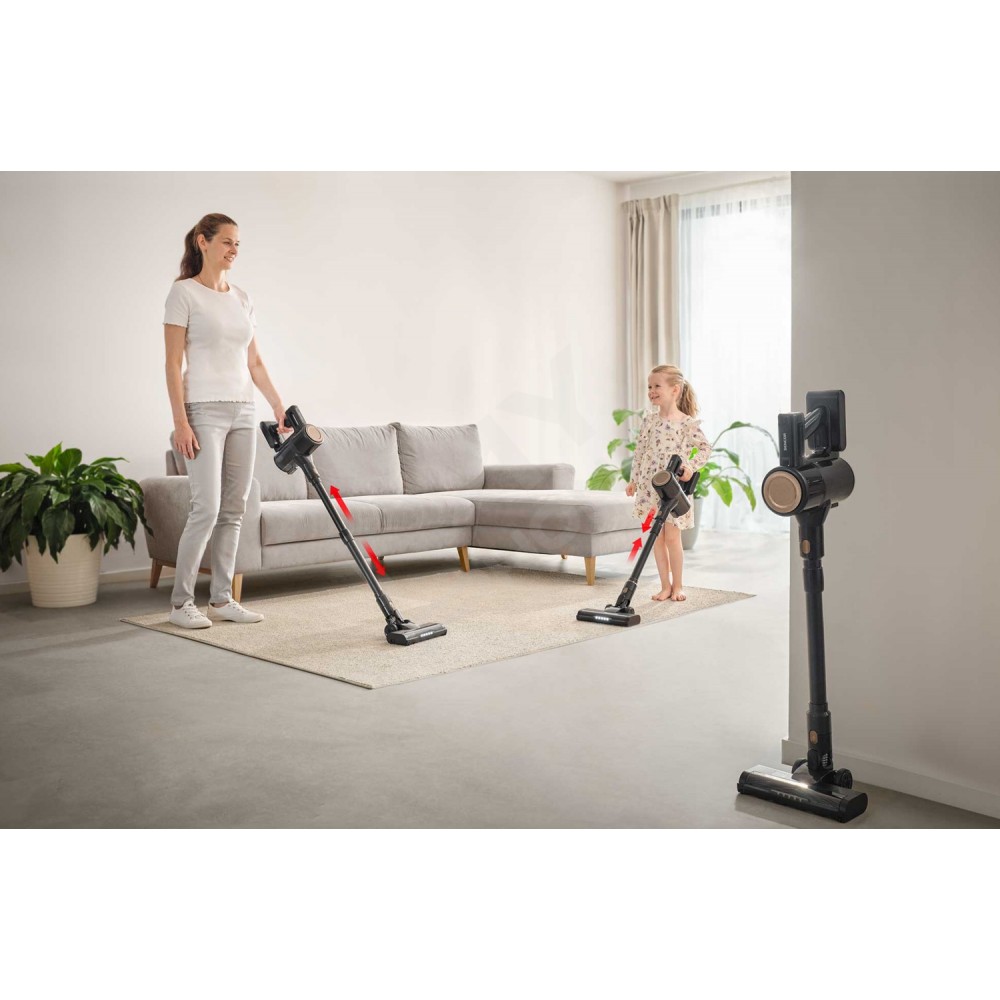 Потужний цифровий мотор 200 Вт забезпечує ефективне прибирання килимів і твердих підлог за допомогою моторизованої насадки і LED-підсвічування, що виявляє навіть найдрібніший бруд. Домашні меблі й автомобільні сидіння легко очистити за допомогою знімної ручної одиниці та моторизованої щітки Cat&Dog. Високоефективна Li-Ion батарея 22,2 В (2 600 мА·год) забезпечує до 35 хвилин роботи.