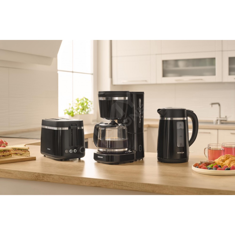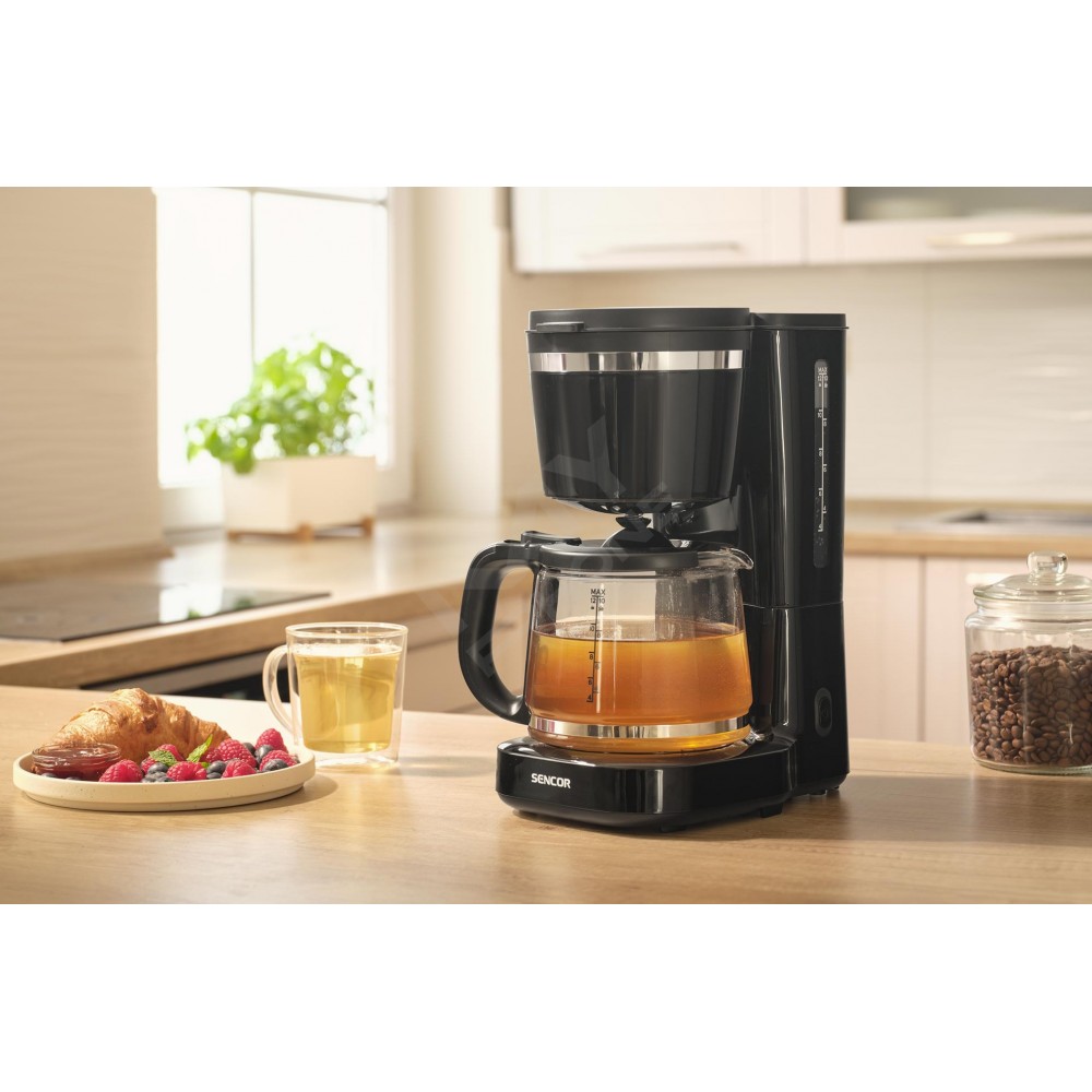 Приготуйте ідеальну чашку за допомогою цієї крапельної кавоварки об'ємом 1,5 л із серії Dark Line. Створена для повсякденної зручності та надійної роботи. Вона оснащена теплоізольованою ручкою та кришкою, що закривається, для безпечного наливання без розливання, а також знімним, миючим постійним фільтром, який також сумісний з одноразовими паперовими фільтрами (розмір 4). Варильна поверхня з антипригарним покриттям зберігає каву гарячою до 40 хвилин, а читабельний індикатор рівня води відразу показує кількість чашок. Ця крапельна кавоварка потужністю 1000 Вт поєднує в собі безпеку, ефективність і простоту використання в одному елегантному дизайні, а також такі практичні доповнення, як функція захисту від протікання, захист від перегріву та світловий індикатор живлення на головному вимикачі.