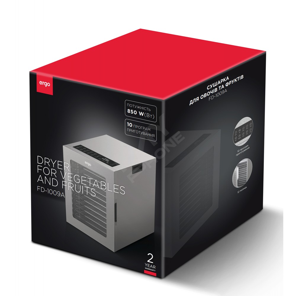 Завдяки корпусу з матової нержавіючої сталі сушарка ERGO FD-1009A має сучасний і стильний вигляд, тож стане справжньою прикрасою будь-якої кухні, водночас не займаючи зайвого місця. Об’єм камери для сушіння 30 літрів, поділений на 12 ярусів, і 10 запрограмованих температурних режимів з діапазоном регулювання 35-75 °С дають змогу приготувати практично будь-які сушені страви у звичайній квартирі.