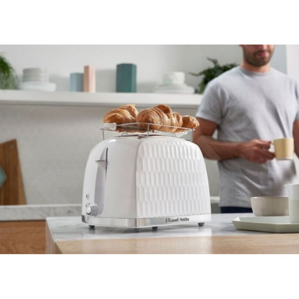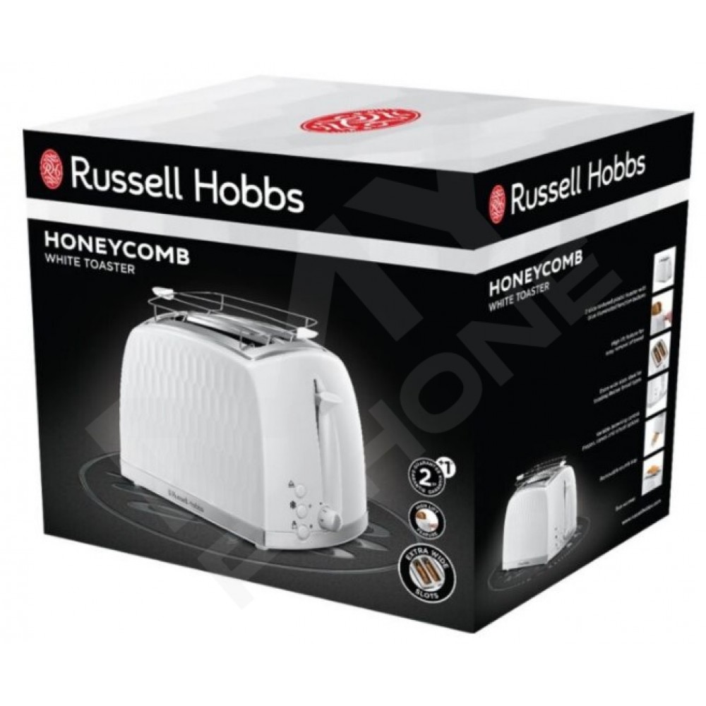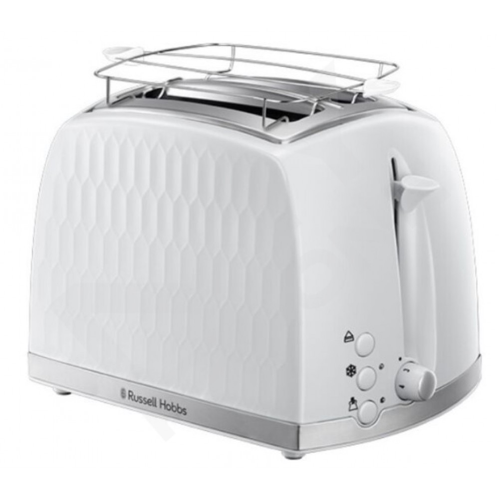 Тостер Russell Hobbs 26060-56 із серії Honeycomb має елегантний текстурований дизайн, не має гострих кутів. Як матеріал використовувався високоякісний білий пластик із хромованими вставками. Потужність тостера становить 850 Вт, що дає змогу швидко та легко готувати смачні тости. Піддон для крихт входить до комплекту, тому стіл завжди залишатиметься чистим, після приготування ароматних тостів. Прогумовані ніжки стійко фіксують прилад на поверхні столу та не пошкоджують її.