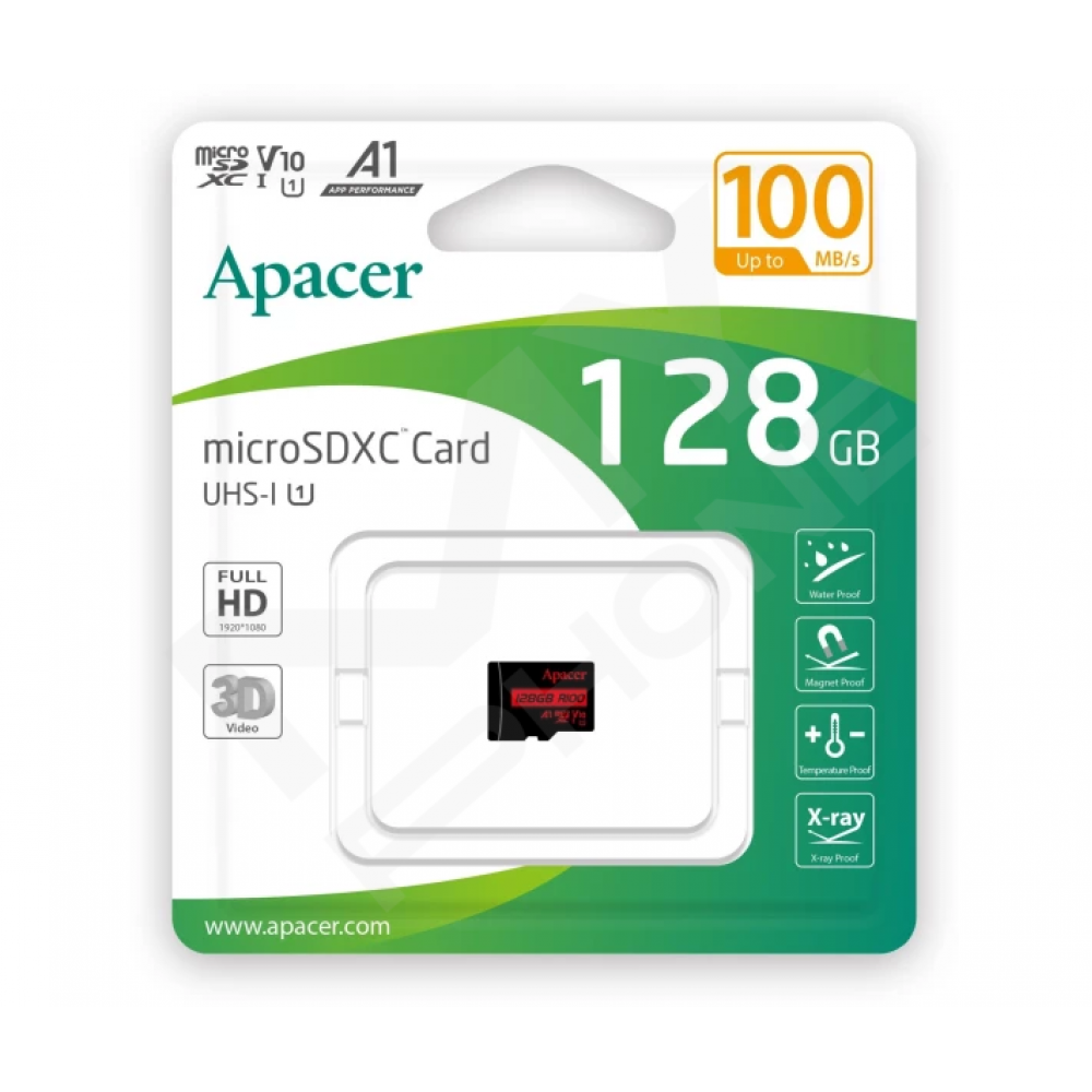 Стандарт UHS Video Speed Class 10 (V10) є гарантією високої надійності та продуктивності для картки пам'яті Apacer microSDXC, яка підтримує режим зйомки у форматі FHD 1080р та запис 3D-відео для мобільних пристроїв.