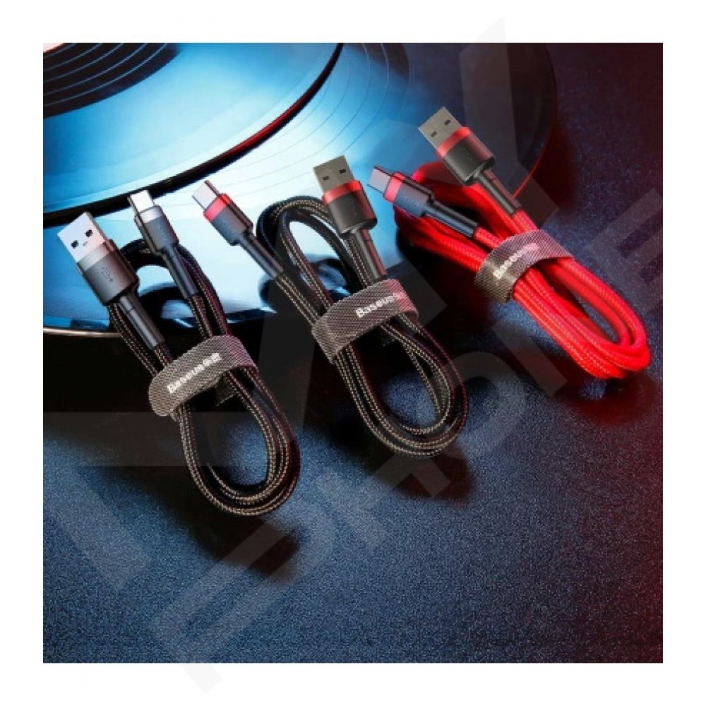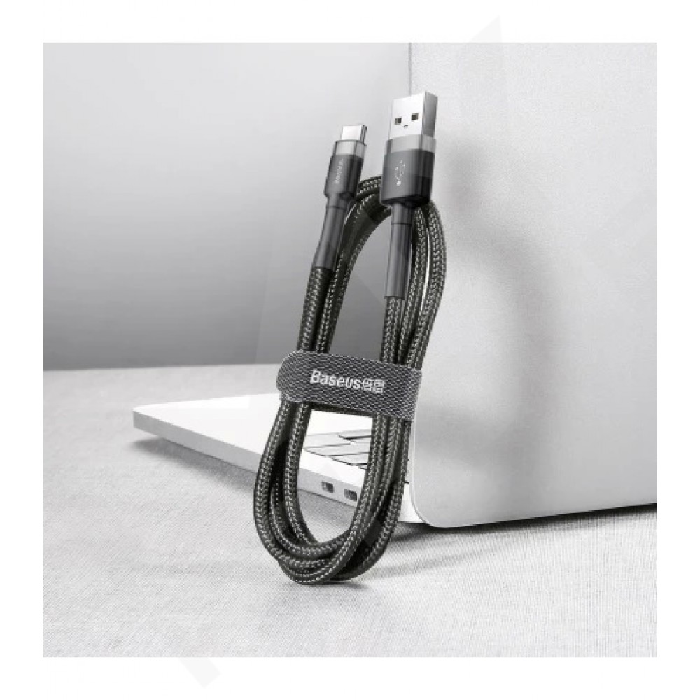 Baseus Cafule USB Type-C 1м (чорно-сірий) — високоякісний кабель для швидкої зарядки та передачі даних. Міцна нейлонова оплітка запобігає заплутуванню та пошкодженням, а посилені роз’єми з алюмінієвого сплаву забезпечують довгий термін служби.