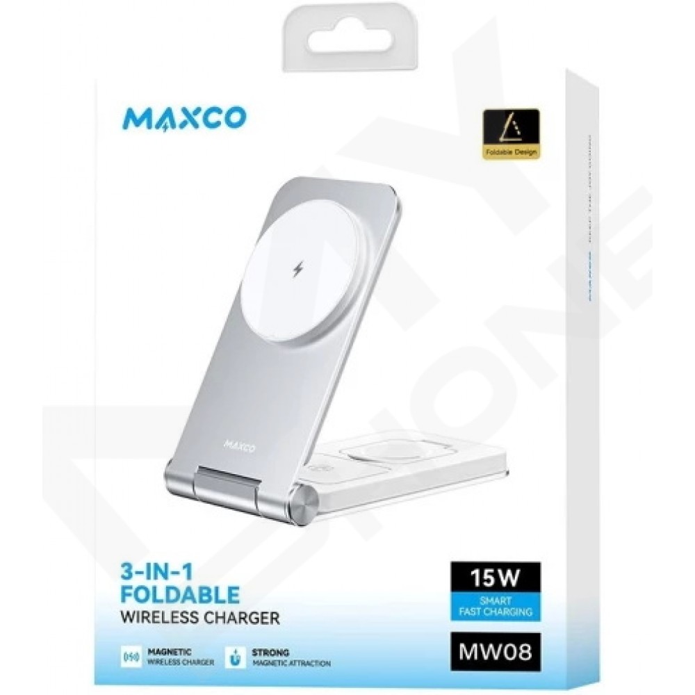 MAXCO 3in1 15W Wireless Charger (MW08) — універсальна бездротова зарядна станція 3-в-1, що дозволяє одночасно заряджати смартфон, бездротові навушники та смартгодинник. Підтримує стандарт Qi і сумісна з більшістю популярних пристроїв Apple, Samsung та інших брендів.