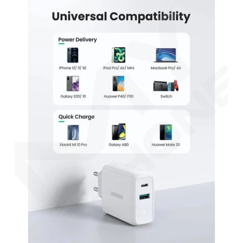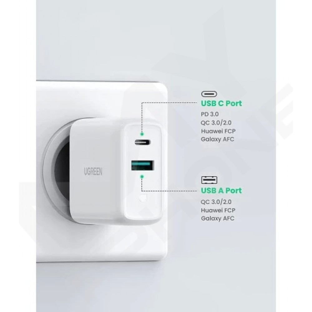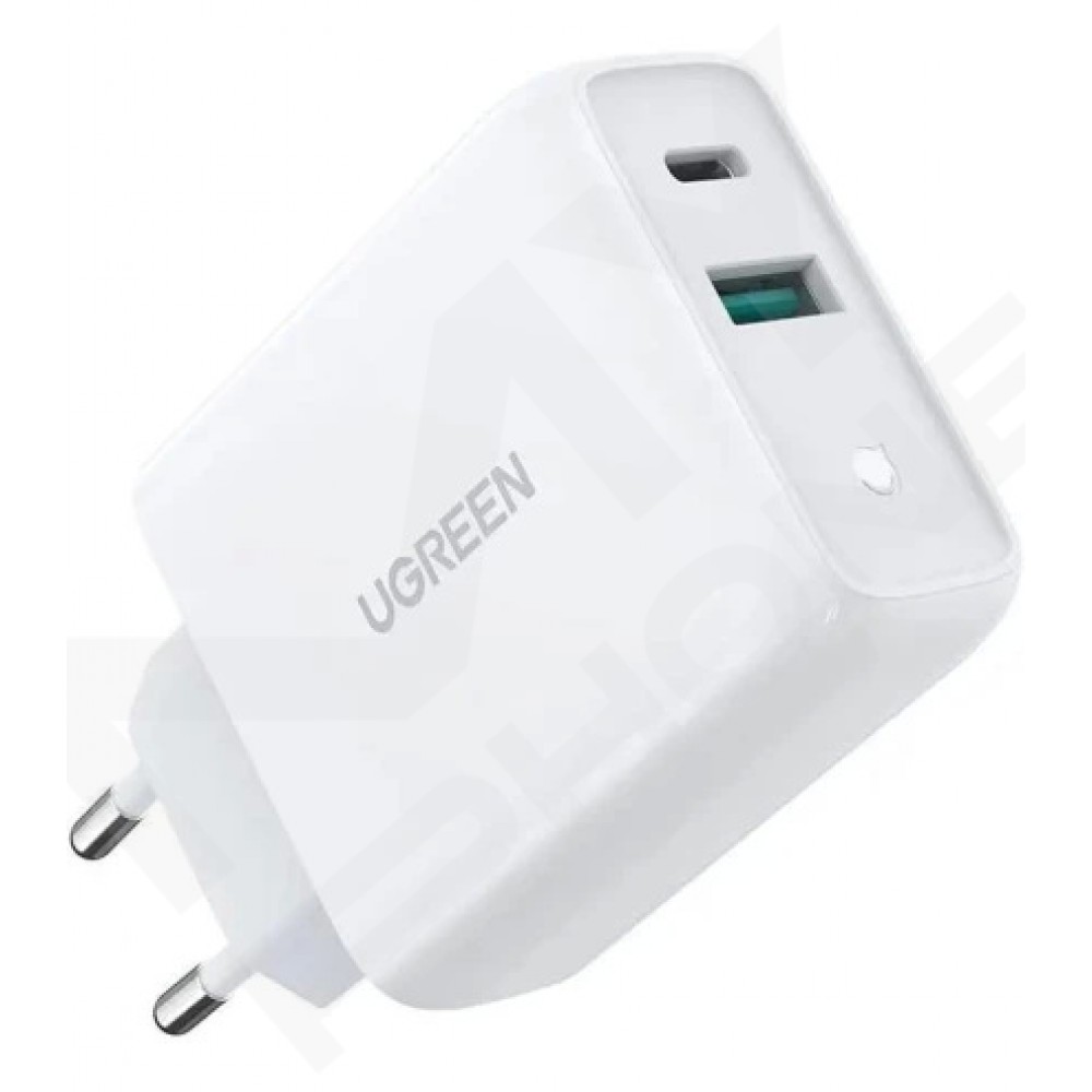 Теги: UGREEN CD170, зарядний пристрій UGREEN, 38W PD QC, Type-C, USB-A, швидка зарядка, Power Delivery, Quick Charge, білий адаптер, блок живлення UGREEN