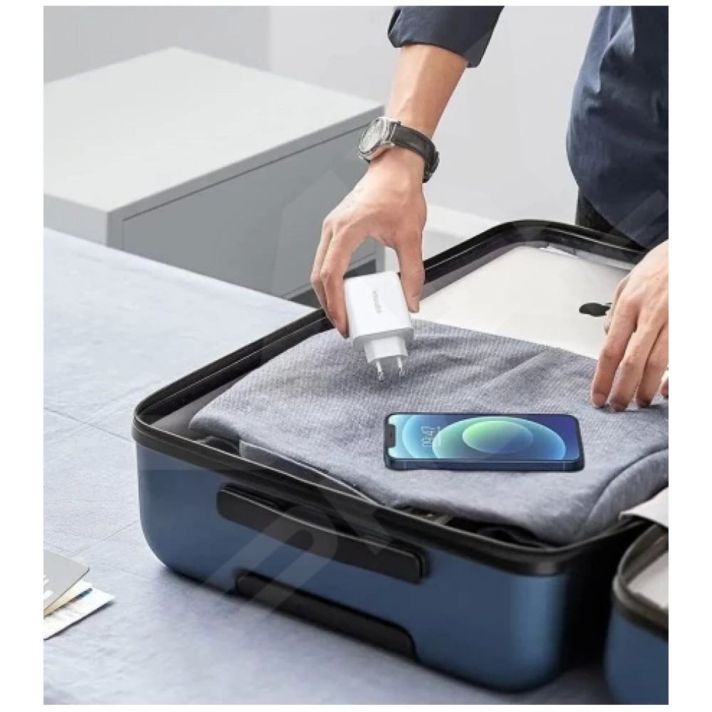 Зарядка виготовлена з вогнетривкого пластику, має захист від перегріву, перевантаження та короткого замикання. Компактний розмір і білий корпус роблять її стильним та надійним аксесуаром для дому, офісу чи подорожей.