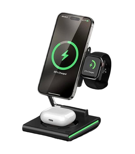 Станція підтримує стандарт Qi Wireless Charging і забезпечує потужність до 15 Вт для смартфонів, а також окремі зони зарядки для годинника та навушників.
