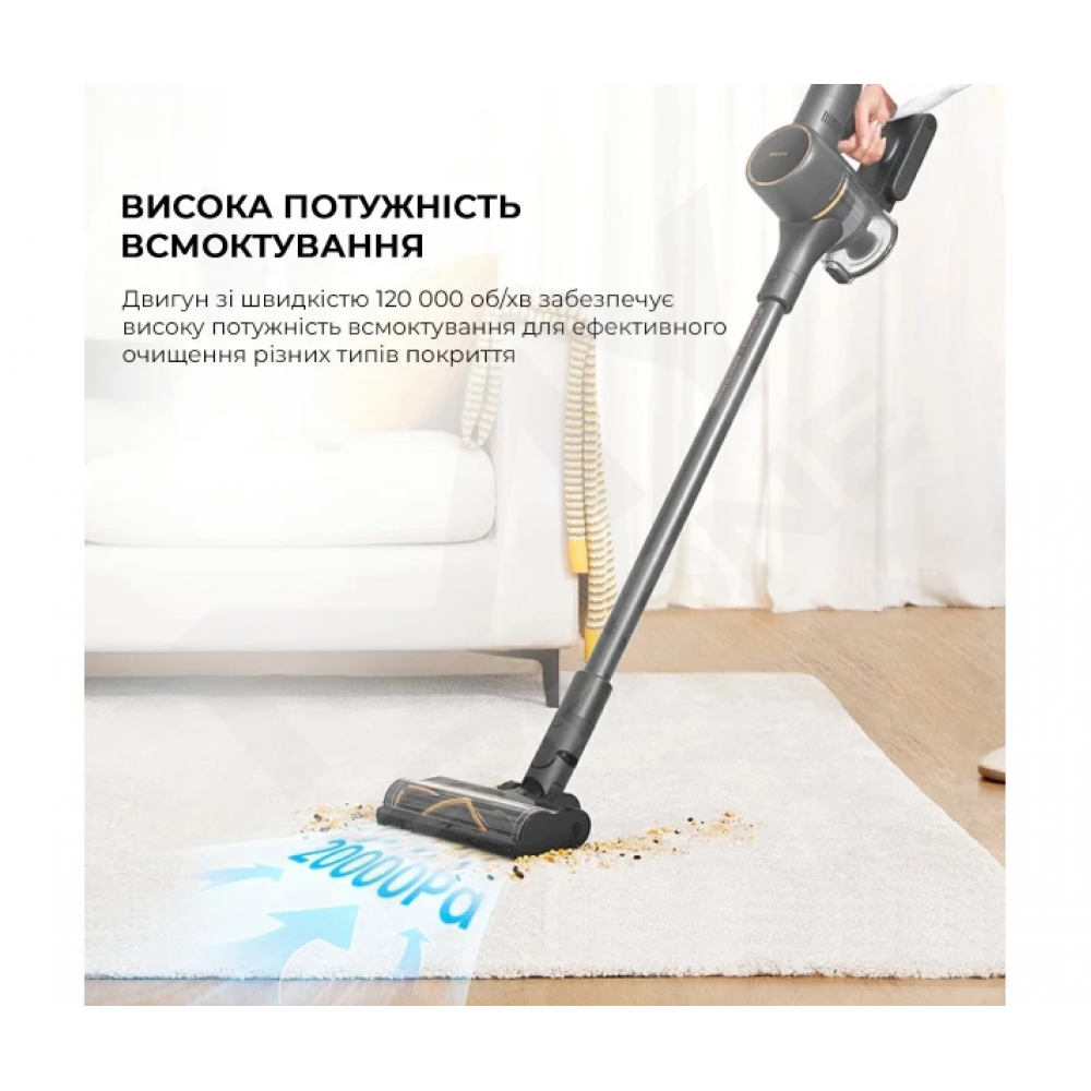 Dreame R10 PRO оснащений потужним мотором та потужним вентилятором для високої ефективності всмоктування пилу, сміття з різних поверхонь, включаючи лінолеум та ламінат, килим та ковролін.