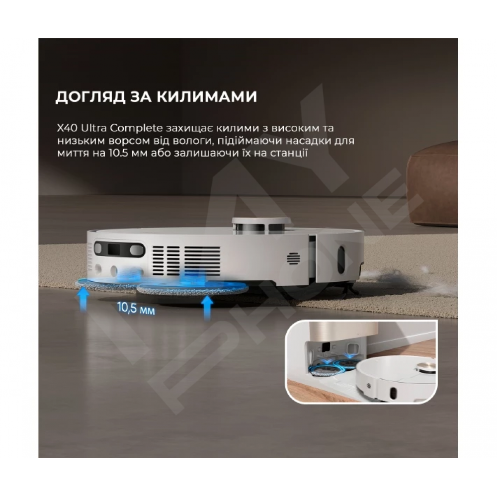 Під час сухого прибирання робот-пилосос X40 Ultra Complete щітка з трьома пучками щетинок висувається вбік. Це дає змогу зібрати сміття у важкодоступних кутах і навколо ніжок меблів, забезпечуючи бездоганну чистоту.