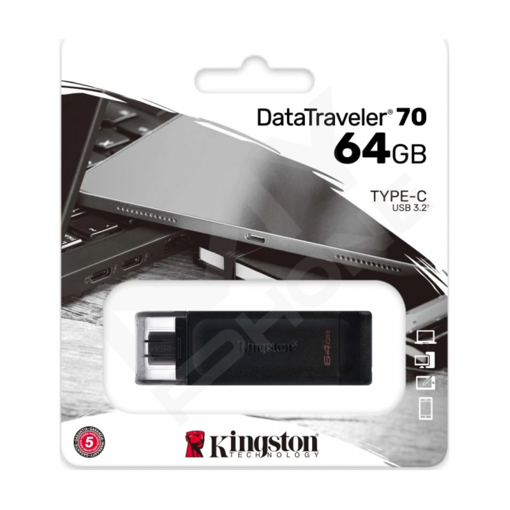 З USB-накопичувачем Kingston DT 70 легко зберігати улюблені фотографії, важливі документи, музику та відеофайли та мати можливість у будь-який час швидко завантажити потрібний файл або поділитися інформацією. Адже ця невелика і легка флешка чудово справляється із зберіганням та перенесенням даних. Накопичувач сумісний з ноутбуками та ПК, а також іншими цифровими пристроями, що підтримують стандарт USB 3.2 Gen 1. На флеш-пам'ять поширюється 5-річна гарантія та безкоштовна технічна підтримка Kingston.