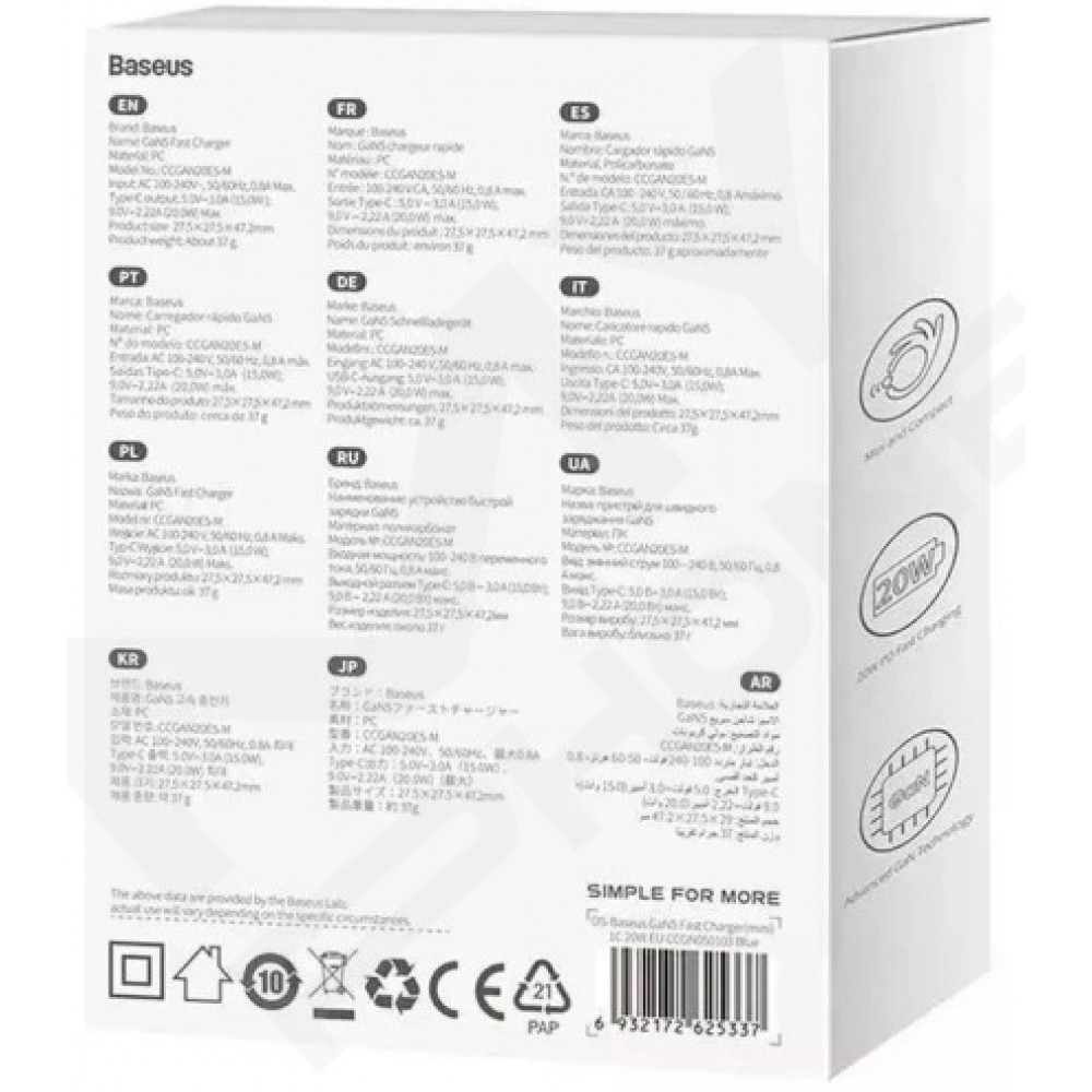 Теги: Baseus CCGN050103, Baseus GaN5, зарядний пристрій 20W, USB-C PD, GaN зарядка, швидка зарядка, блакитний адаптер, блок живлення