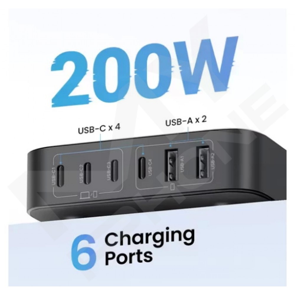 UGREEN CD271 2U+4C 200W GaN FC — це потужний багатопортовий зарядний пристрій преміум-класу, створений на основі передової технології GaN (нітрид галію). Він забезпечує сумарну потужність до 200 Вт, дозволяючи одночасно заряджати до 6 пристроїв — 4 через порти USB Type-C і 2 через USB-A.